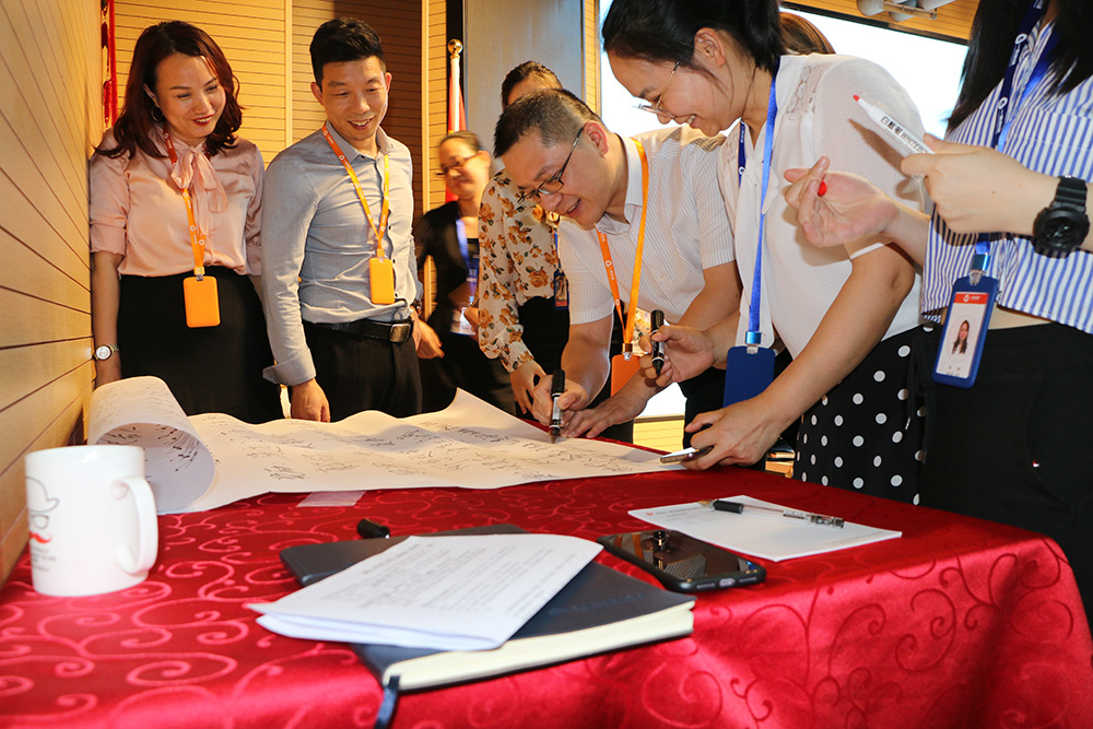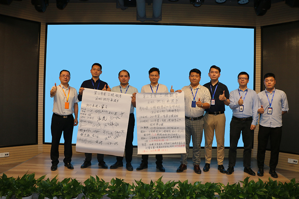 在宣讀第二季度目標(biāo)執(zhí)行承諾書的內(nèi)容之后,渠道銷售部和工程銷售部的銷售精英以及支持他們的同事在第二季度目標(biāo)執(zhí)行承諾書上簽字,從簽名的數(shù)量上可以大致看出大家對(duì)這兩個(gè)團(tuán)隊(duì)第二季度的未來(lái)可期。